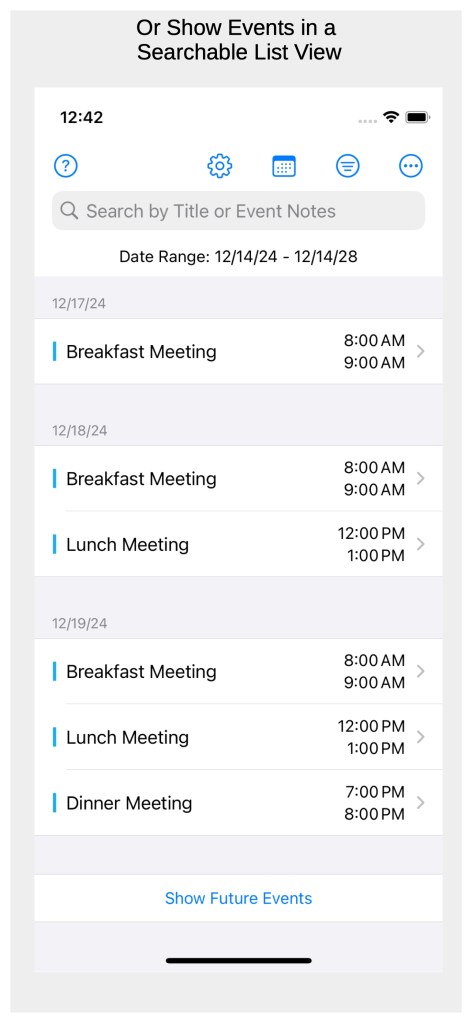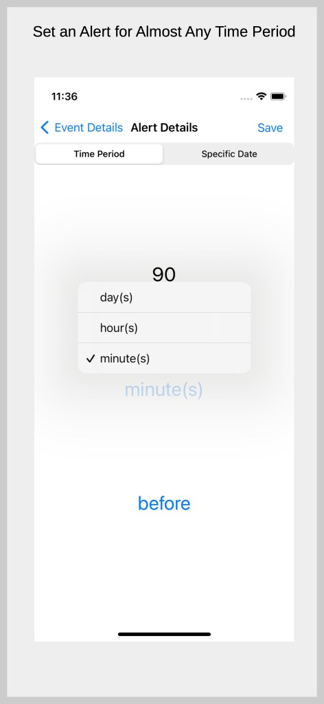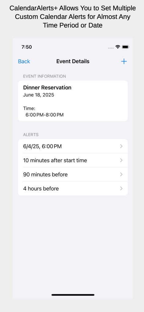CalendarAlerts+ breaks through the iOS Calendar apps limits on the kind and number of alerts you can set per calendar event (a maximum of 2 alerts for 10 predefined time periods, fewer for all-day events)
