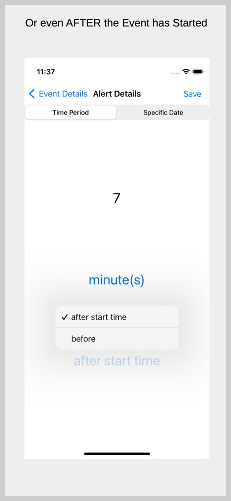 CalendarAlerts+ allows you to create and edit an unlimited* amount of alerts per event for time periods ranging from 0 to 99999 minutes, hours or days before or even AFTER* the start time of a calendar event. In addition, you can set an event for a specific date and time rather than a relative time period.