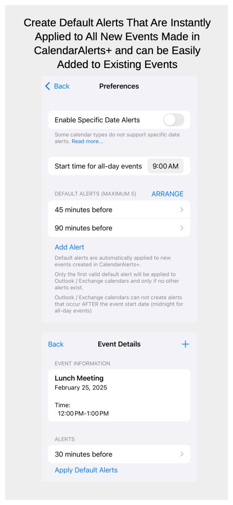 - Create default alerts that are instantly applied to any new events created in CalendarAlerts+ and can be easily added to any existing events