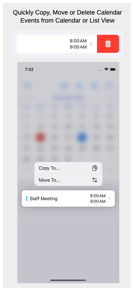 - Quickly copy, move and delete calendar events within CalendarAlerts+